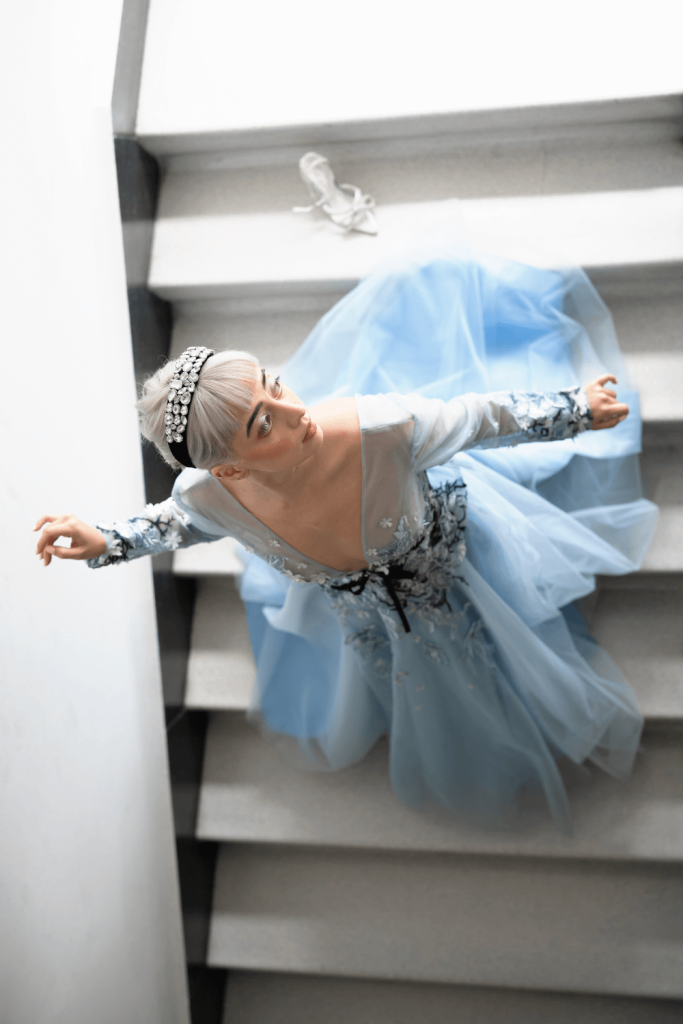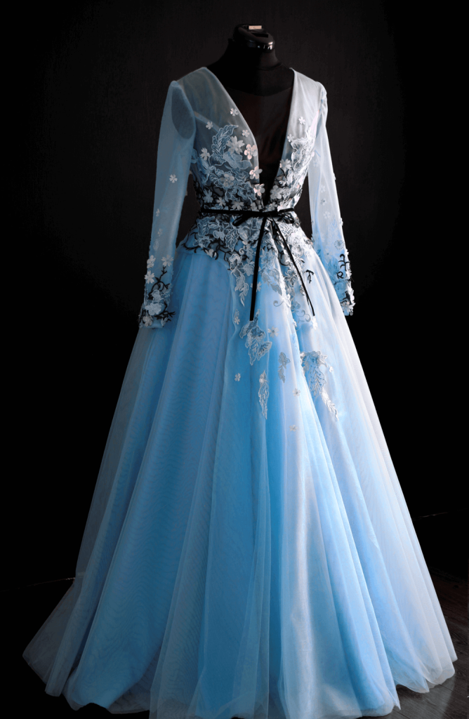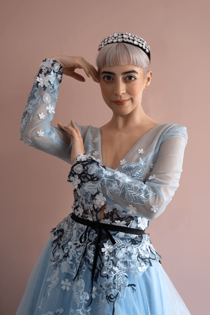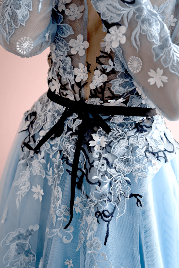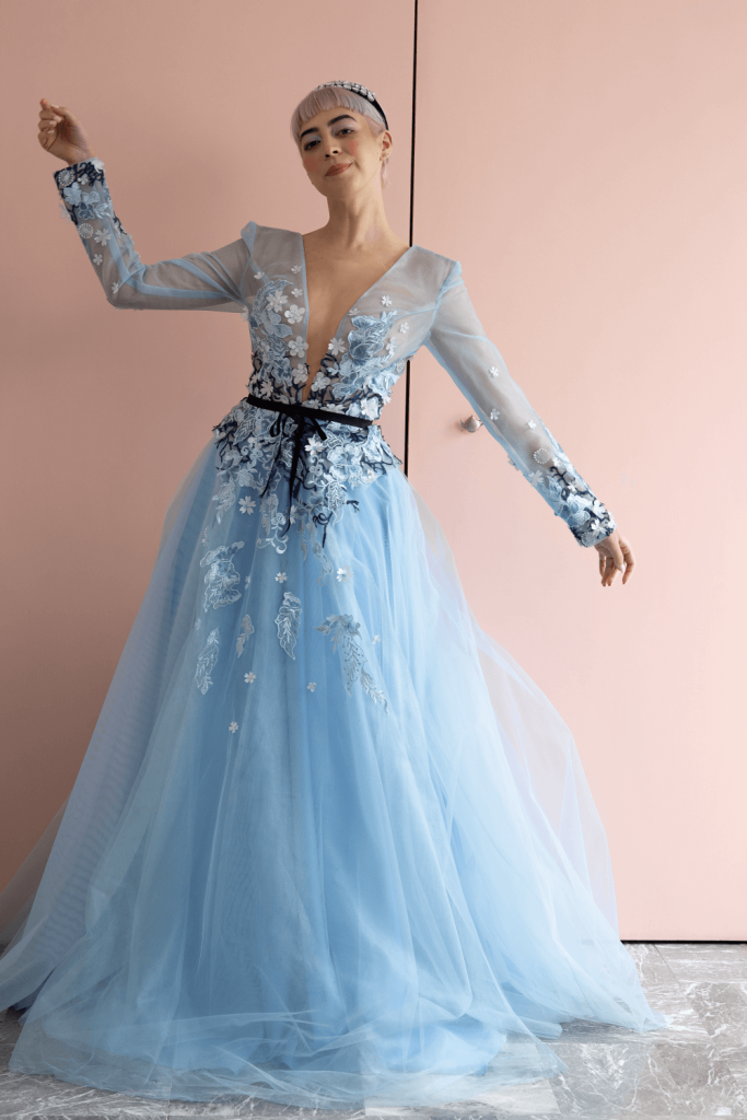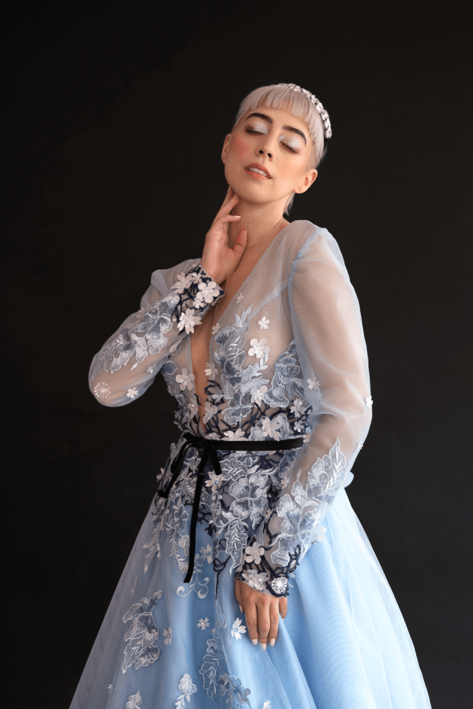 “Cristal” es un vestido embellecido por su tono celeste y bordados de flores en diversos colores. Con mangas largas, este vestido resalta la singularidad de una novia disruptiva y única.